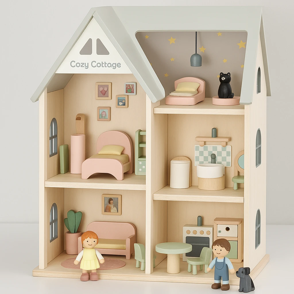 תנו לילדים שלכם להיכנס לעולם דמיון עשיר עם ה-Cozy Cottage: בית בובות עץ חמים ומרשים, בשלושה מפלסים עם חמשת החדרים – סלון, מטבח, חדר שינה, חדר רחצה ועליית גג עם עיטורים של כוכבים. כולל 31 חלקים: רהיטים מלאים, שתי בובות, חתול, וכל פרט שמגיע עם איורים עדינים שישדרגו כל חדר.